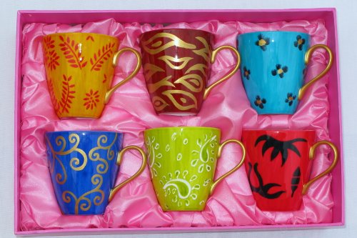 Fabuleux coffret de six tasses à cappuccino, chacune avec un dessin différent et une poignée dorée. Des soucoupes avec les mêmes dessins (mais coloris différents) sont vendues séparément.