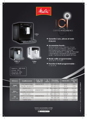 Melitta Caffeo CI E970-103 Caffeo CI (Coffee Intelligence) Coffee Intelligence, tous vos goûts mémorisés ! CAFFEO CI vous offre la personnalisation et la mémorisation de 6 spécialités de café pour tous les membres de la famille (4 utilisateurs). Tout le plaisir d'un café personnalisé en toute simplicité. Ses principaux atouts • Une machine très intelligente - Il est possible de mémoriser jusqu’à de 24 préparations, avec le prénom de l’utilisateur, grâce à la touche My Coffee: 4 utilisateurs, 6 préparations par utilisateur. - La seule machine automatique avec une réelle fonction cappuccino et latte macchiato respectant l’ordre des ingrédients comme les professionnels, pour un résultat visuel et un go...